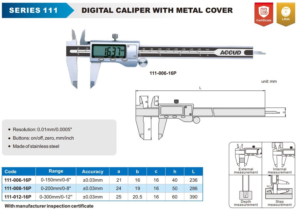 ACCUD 111-006-16P DIGITAL CALIPER WITH METAL COVER, 150mm/6"