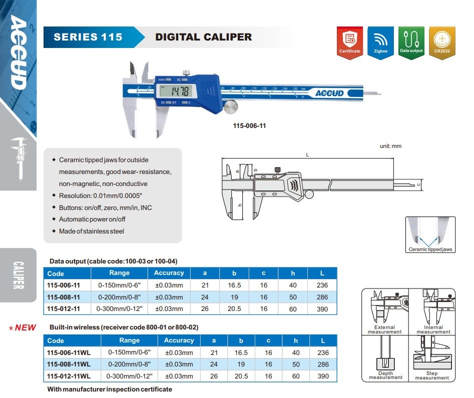 ACCUD 115-008-11 DIGITAL CALIPER 200mm/8" WITH CERAMIC TIPPED JAWS ( 0.01mm/0.0005" ), data output
