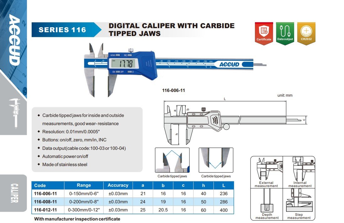 ACCUD 116-006-11 DIGITAL CALIPER 150mm/6" WITH CARBIDE TIPPED JAWS ( 0.01mm/0.0005" )