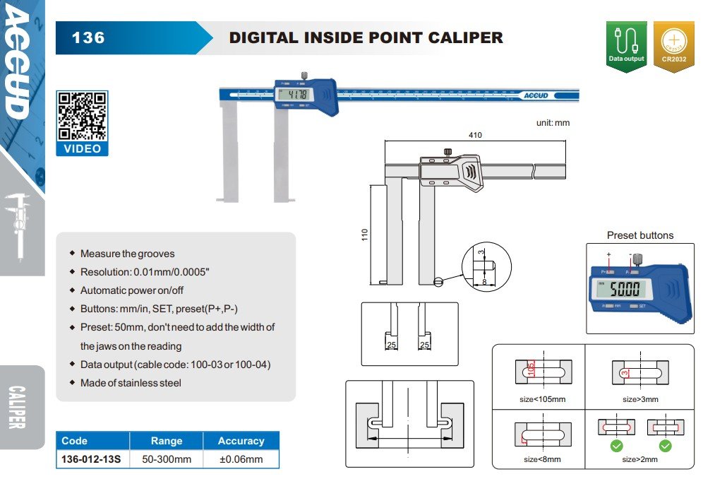 ACCUD 136-012-13S DIGITAL INSIDE POINT CALIPER 50-300mm jaw length 110mmm ( 0.01mm/0.0005" )
