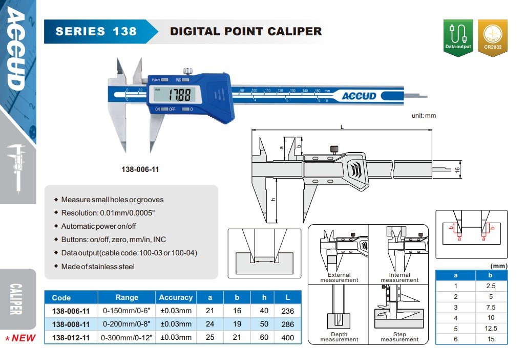 ACCUD 138-006-11 DIGITAL POINT CALIPER 150mm/6" ( 0.01mm/0.0005" )