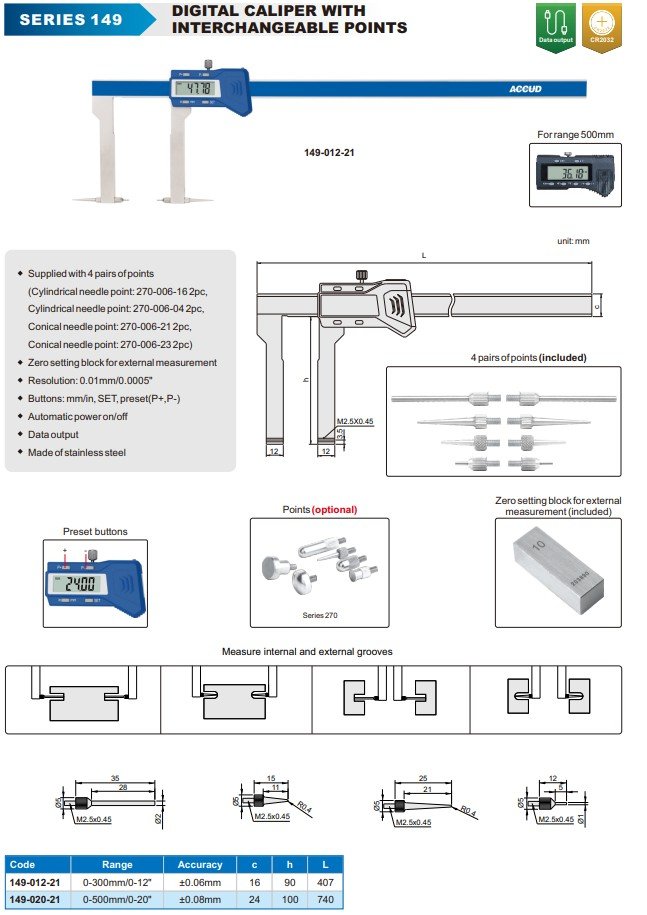 ACCUD 149-012-21 DIGITAL CALIPER WITH INTERCHANGEABLE POINTS 300mm/12" ( 0.01mm/0.0005" )