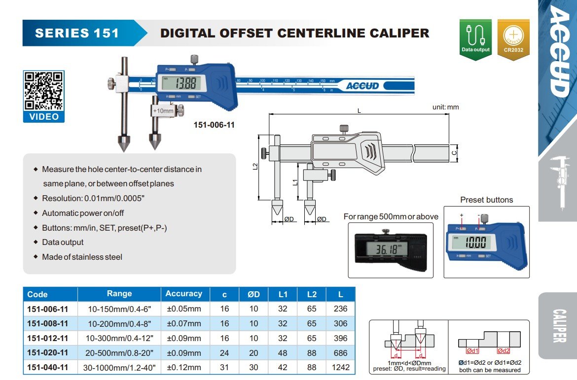 ACCUD 151-006-11 DIGITAL OFFSET CENTERLINE CALIPER 10-150mm ( 0.01mm/0.0005" )