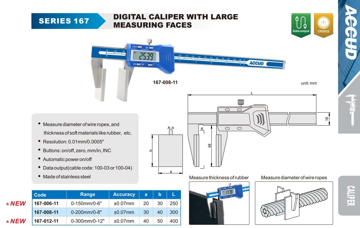 Special digital caliper with extended arms designed for measuring steel cables and soft materials such as rubber. Measurement accuracy 0.07mm, CR2032 battery, data output - possibility of connection to a PC via USB cable, made of stainless steel.