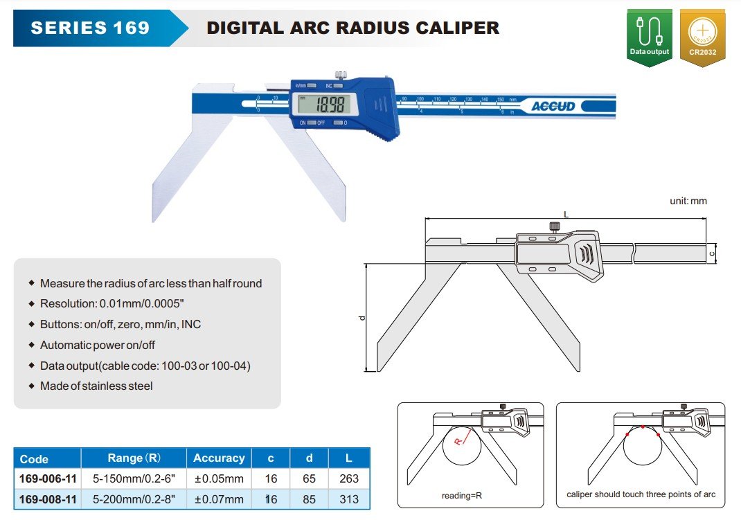 ACCUD 169-006-11 DIGITAL ARC RADIUS CALIPER 5-150mm/0.2-6" ( 0.01mm/0.0005" )