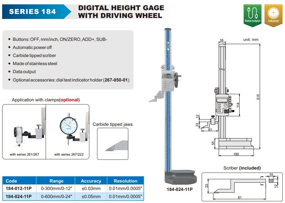 ACCUD 184-024-11P DIGITAL HEIGHT GAGE WITH DRIVING WHEEL, 0-600mm/0-24"