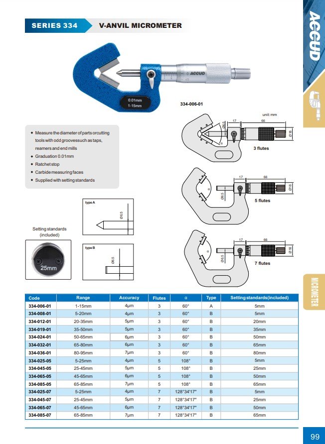 ACCUD 334-065-05 MICROMETER 45-65mm V-ANVIL 5 flute 108° (0.01mm)