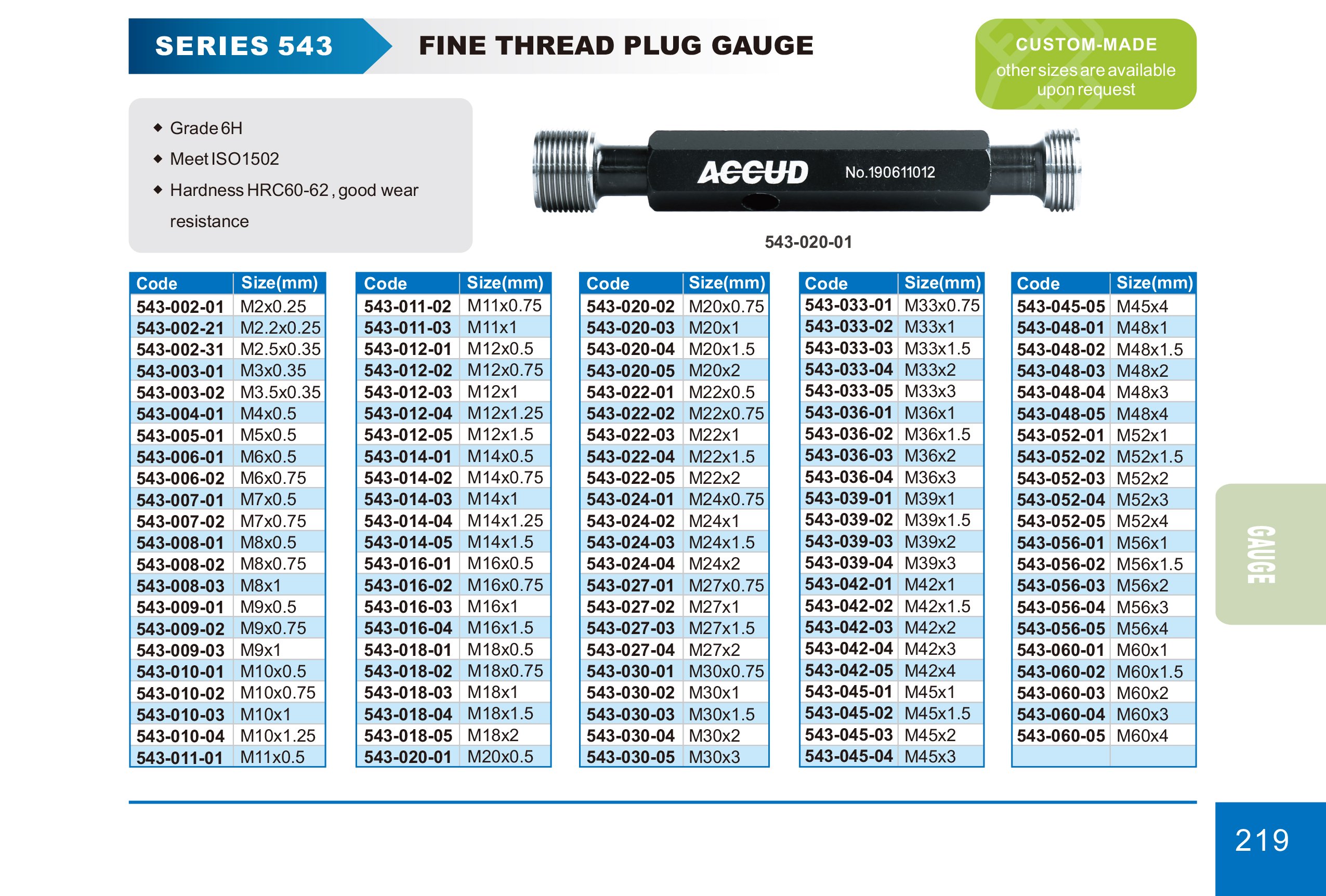 ACCUD 543-112-02G FINE THREAD PLUG GAUGE, GO, 6G / M112*2 /