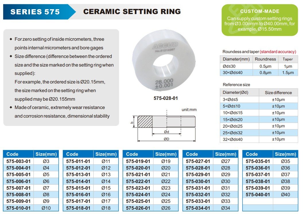 A ceramic setting ring is used for precise zero setting of inside micrometers and three-point internal micrometers. It offers high resistance to wear and corrosion and ensures long-term dimensional stability for accurate measurements.