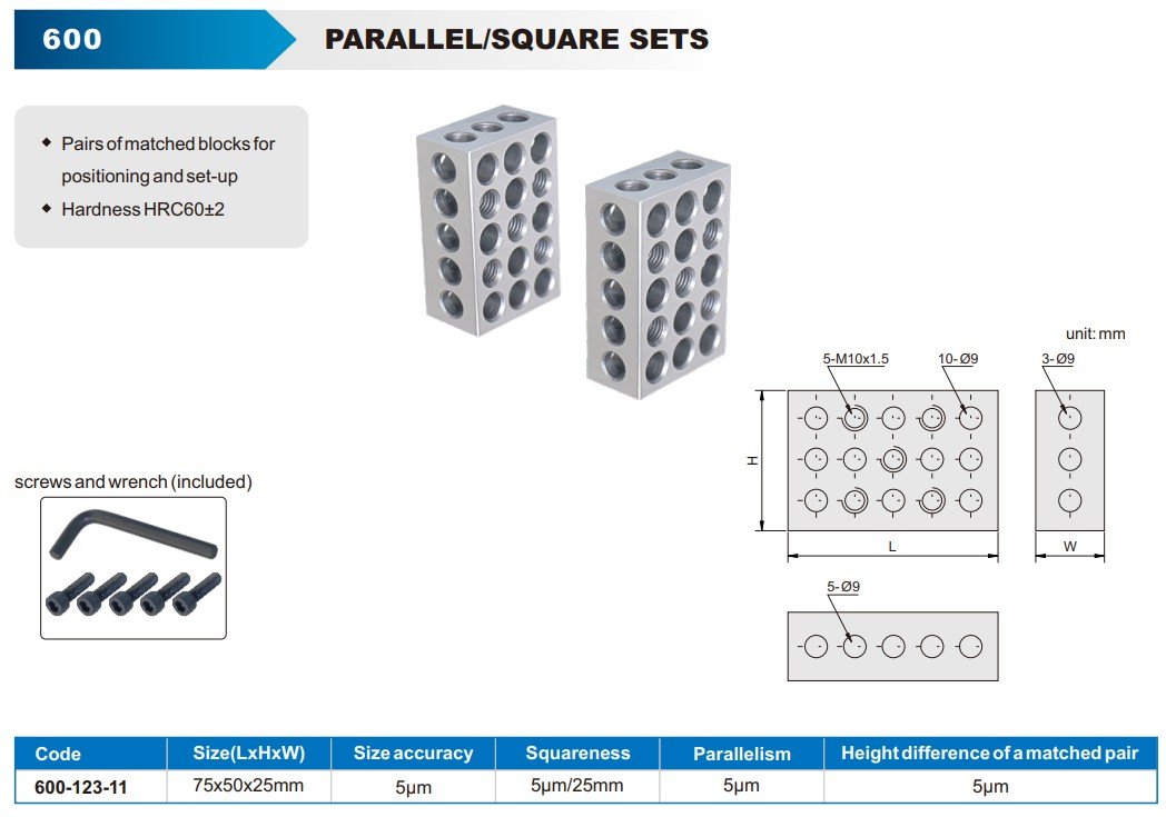 Pairs of matched blocks designed for precise positioning and setup. Made from high-quality material with a hardness of HRC 60±2. Ideal for measurement, inspection, and setup in engineering and precision manufacturing.