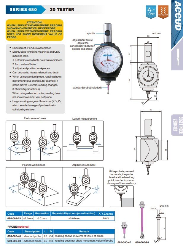 Durable 3D Tester for CNC and Milling Machines – Accurate Measurement and Workpiece Positioning. Shockproof and dust/waterproof (IP67). Allows quick determination of coordinate points, finding the center of holes, and precise positioning of workpieces. Can also be used to measure length and depth. Large working range across all three axes (X, Y, Z) minimizes the risk of probe damage.