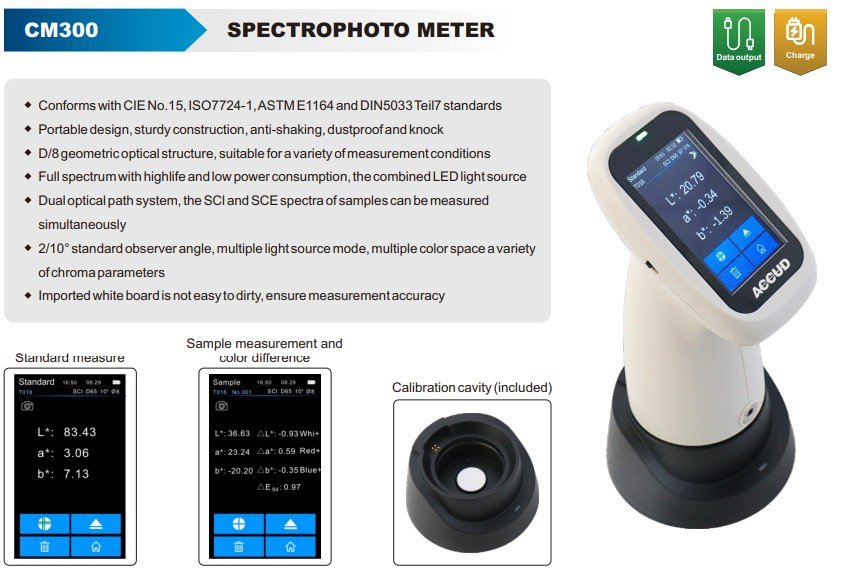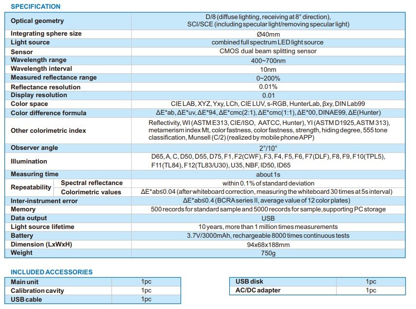 - Other colorimetric index: Reflectivity, WI (ASTM E313, CIE/ISO, AATCC, Hunter), YI (ASTM D1925, ASTM 313), metamerism index Mt, color fastness, color fastness, strength, hiding degree, 555 tone classification, Munsell (C/2) (realized by mobile phone APP)