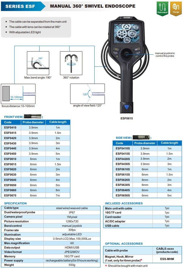 ACCUD ESF0415 MANUAL 360° SWIVEL ENDOSCOPE, 3.9mm/1.5m ( front view )