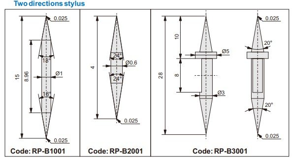 Two directions measuring styli of the RP series are designed for precise measurement of surface roughness and contours when used with roughness and contour measuring instruments.